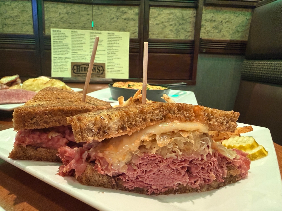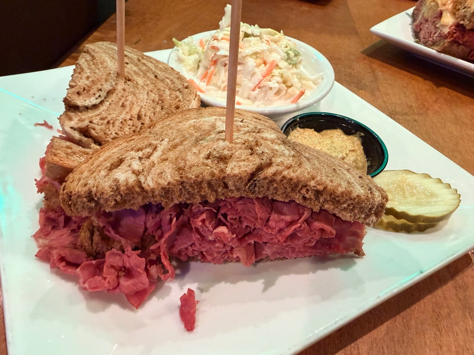 Corned beef topped with sauerkraut, Swiss cheese and O’Blitzen’s signature sauce on grilled marble rye bread. Served with fries or coleslaw