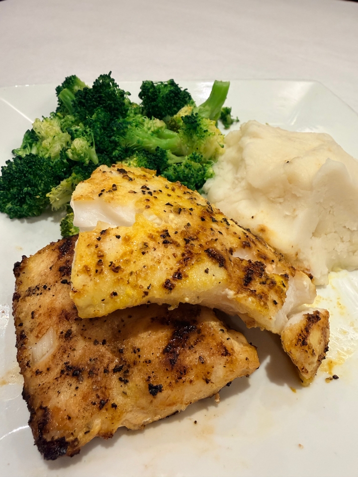 Lemon pepper seasoned and grilled cod, served with broccoli and mashed potatoes.