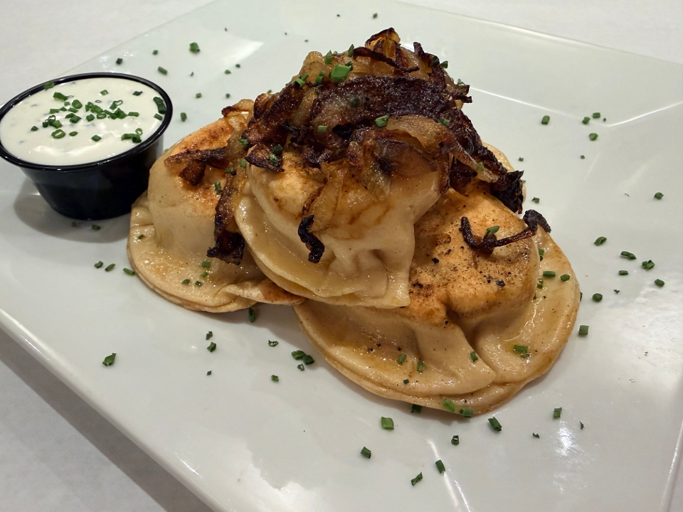 Famous Pierogi Lady potato cheddar pierogies (4ea) with caramelized onions and sour cream. Served with choice of one side.