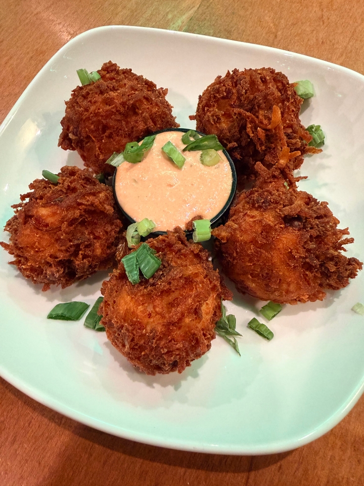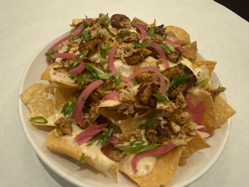 Blackened Shrimp, Crab Meat, Queso, Corn Tortilla Chips garnished with pickled red onions and scallions