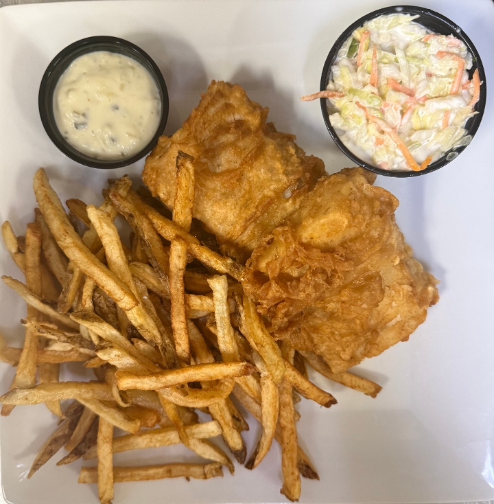 2 Pieces House battered premium cod fish served with fries, coleslaw, and tartar sauce.