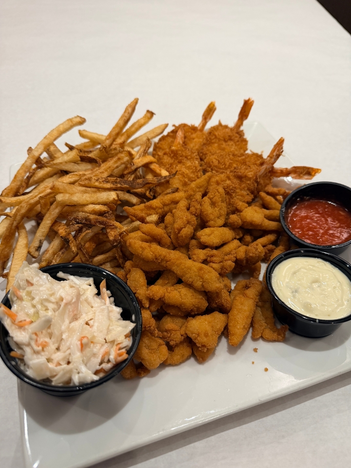 5 Breaded Butterflied Shrimp & Breaded Clam Strips served with fries, coleslaw & cocktail sauce