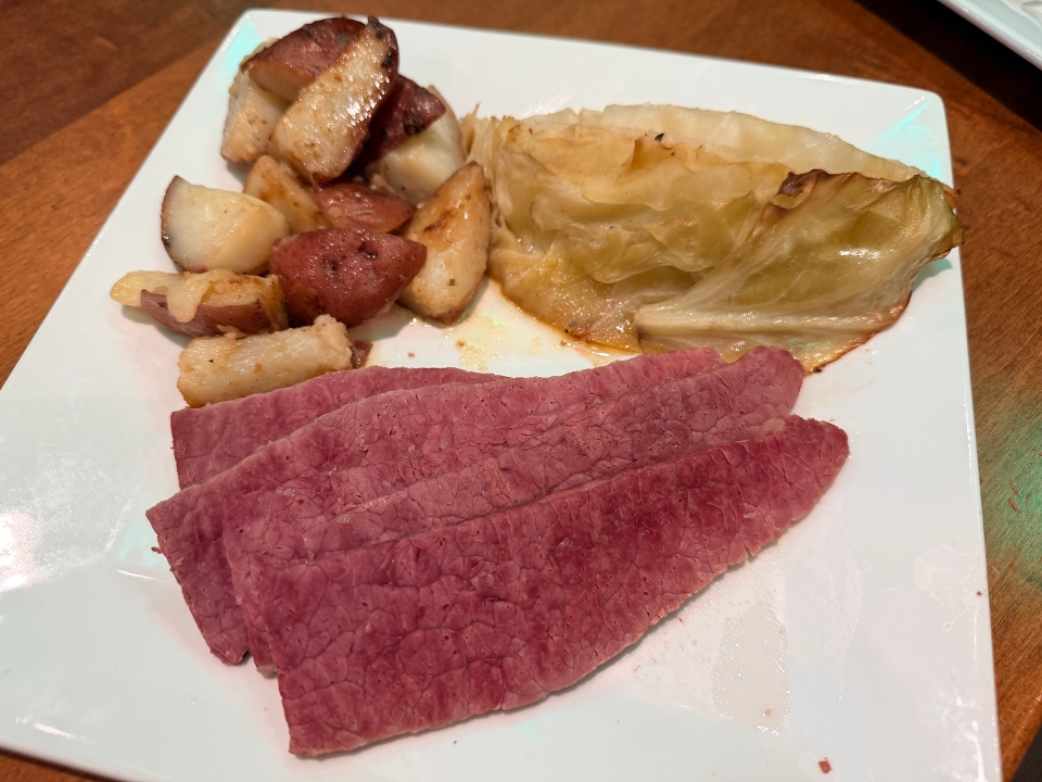 Corned beef served with braised cabbage and garlic buttered potatoes